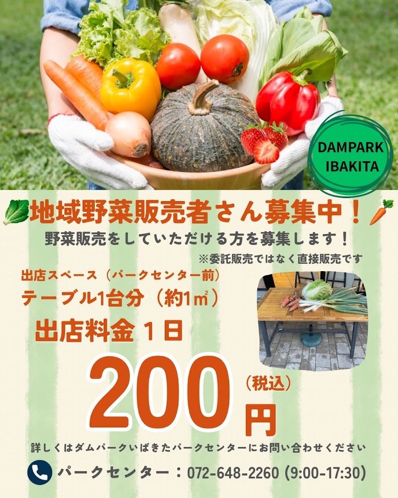 ダムパークいばきたでは、 地域の生産者のみなさまによる野菜販売を 2026年2月1日(日)よりスタートします。この取り組みにご協力いただける 地域の野菜生産者さんを募集しています!