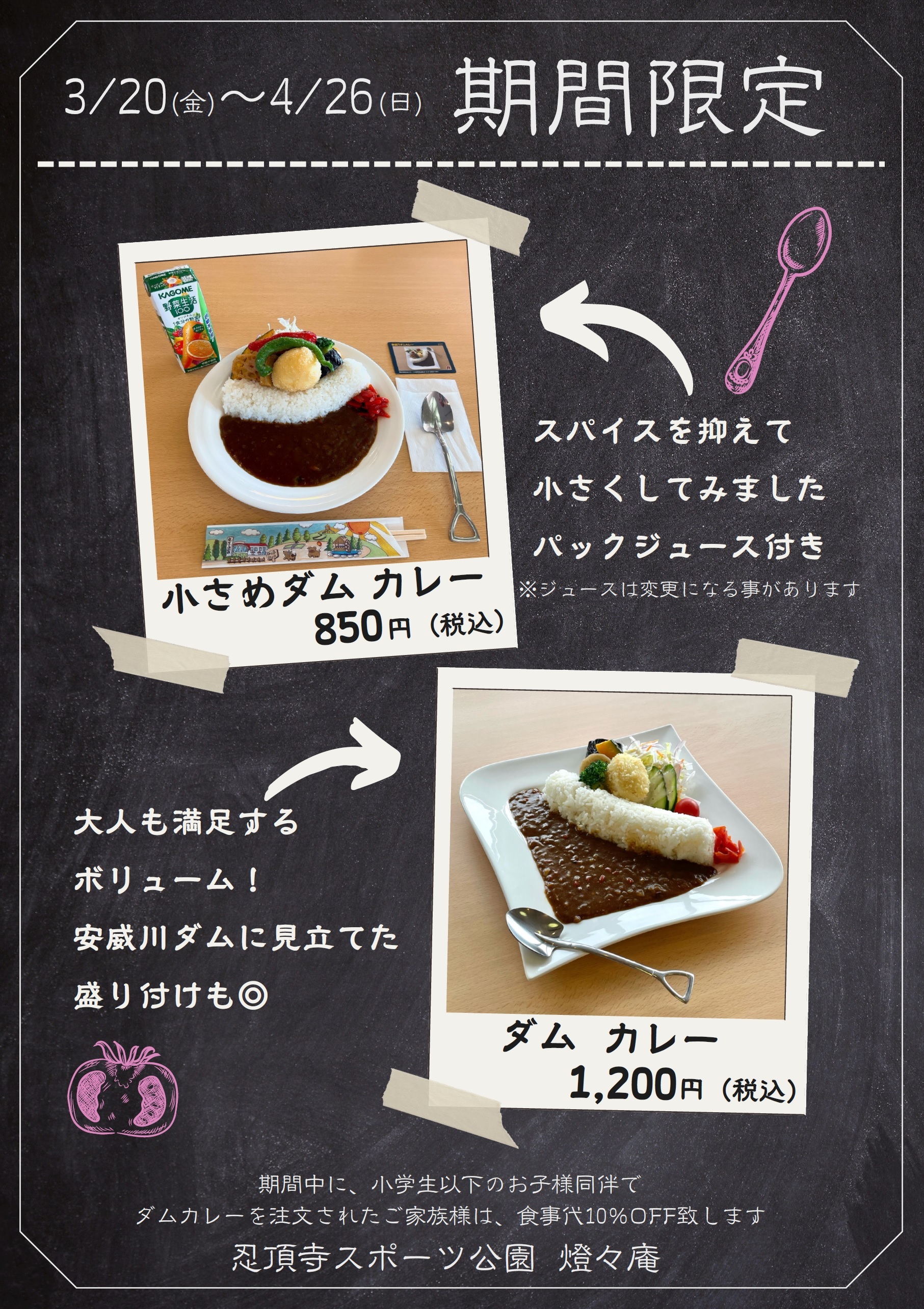さらにさらに、小学生以下のお子様同伴で、ダムカレーor小さめダムカレーを含む食事をされたご家族様は、食事代10%OFFになります。
